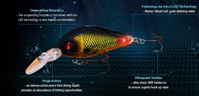 The Trance features our new micro LED that allows us to fit our technology inside a lure so small. The 50mm minnow has a suspending buoyancy, this works in brilliantly with the LED sitting on the spot flashing. You will notice more bites from the LED in dirty water, overcast conditions, dawn/dusk and after dark. Diving to 6 feet you can cover a wide variety of scenarios and fish including Bass, Bream, Trout, Red Fin and many more.