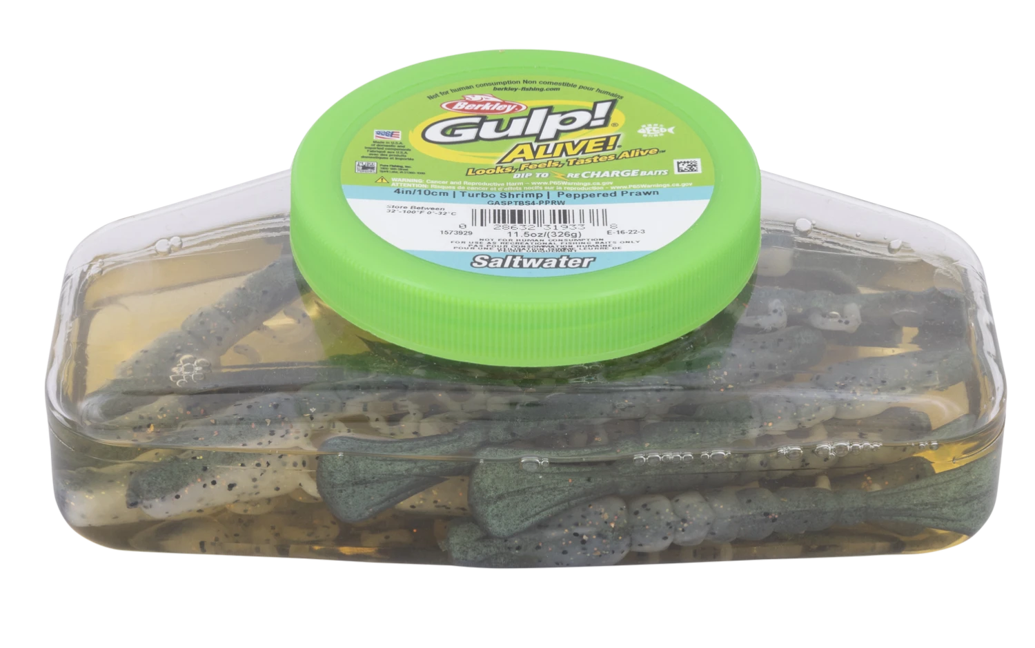 The Gulp!® Turbo shrimp is the next evolution of shrimp imitations and is now also available in the convenient Gulp! Alive!® formula. Gulp! Alive!® ensures that each bait is perfectly formed and is 100% hydrated with that secret fish attractant that Gulp!® is known for. This guarantees that each of the unique legs on the Gulp!® Turbo Shrimp generate high frequency vibrations with maximum scent dispersion that fish simply cannot resist. The Gulp! Alive!® 4” Turbo Shrimp is available in a range of four vibrant and earthy colours to give you the ultimate fishing advantage wherever you cast.