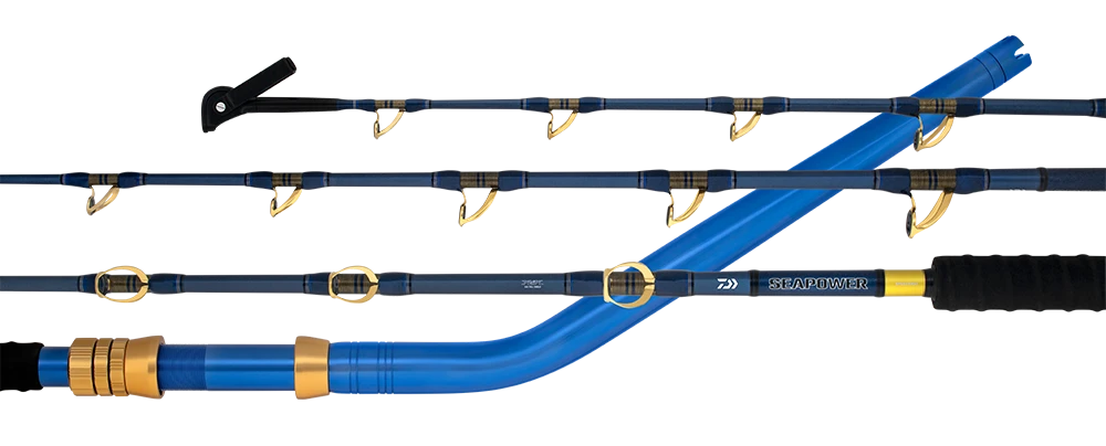 SEAPOWER sports a blank constructed from Daiwa’s GLATECH material, a combination of a carbon core wrapped perpendicular to the rod blank and longitudinal single axis fibreglass material which gives SEAPOWER the desired soft and shock absorbing nature. Since almost all fights are conducted with the rod in a gunwale rod holder, a softer blank action is desirable for electric rods.