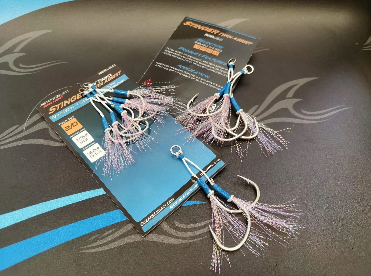 Professionally tied with “Fluorocore Cord” using ultra sharp spade styled slow jigging hooks. Our sleek design allows for minimum water resistance maximising jig action. We use 2 toned high quality UV tinsel to increase bite rates. Our sizes caters for offshore and shore jigging applications including micro, slow pitch and deep drop jigging. Can be attached at the top of jigs and also run as a rear stinger.