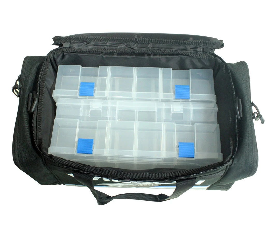 The Wilson Tackle Bag (large deep) is a 50cm x 30cm x 28cm bag that contains 1 large tackle tray that can have up to 24 compartments per tray and 2 deep tackle trays that can have up to 22 compartments.